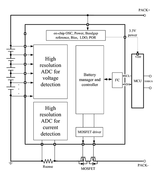鋰電池組保護芯片HSM12X0系列包括HSM1220、HSM1230和HSM1240。該系列芯片內(nèi)部集成了高精度ADC可以對電池組的電壓、電流以及溫度信號進行采集并通過I2C接口將數(shù)據(jù)傳遞給主機微控制器。該芯片還具有簡單的過壓保護、欠壓保護、過流保護以及短路保護,支持被動均衡。