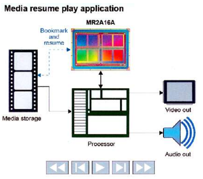 MRAM還適用于具有簡(jiǎn)歷播放功能的娛樂(lè)應(yīng)用程序。掉電期間,指示播放媒體時(shí)間戳的書簽會(huì)快速存儲(chǔ)在非易失性MRAM中。然后幾乎立即進(jìn)行后續(xù)播放并繼續(xù)播放(下圖1)。