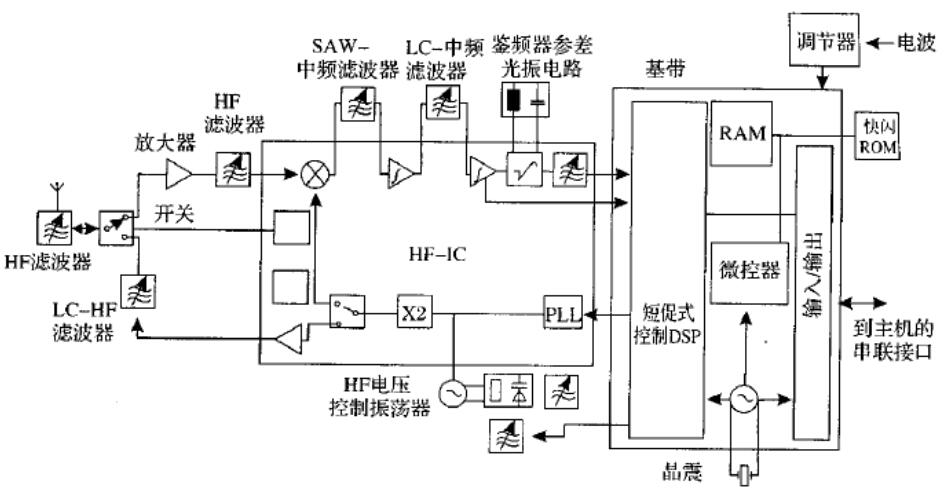 圖1藍牙無線電系統(tǒng)(最少兩個芯片)的典型方案右邊為基帶處理器,左邊為高頻模塊,附加濾波器和天線開關(guān)元件