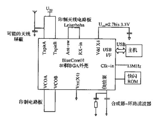 圖2單芯片藍牙方案“Bluecorco1”,只需少量外接元件,尤其是沒有電感、微調(diào)電容器、共振器或濾波器