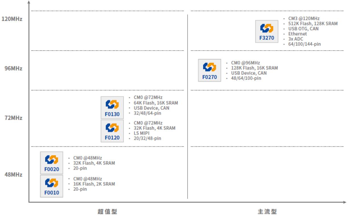 在超值型產(chǎn)品中,增加了可用的GPIO數(shù)量,并提高了72MHz M0產(chǎn)品的存儲容量比,以便支持更強的計算處理能力。