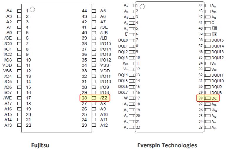 MRAM,組織為256kx16,由標(biāo)稱3.3V電源供電,并與FRAM兼容。兩款產(chǎn)品均使用標(biāo)準(zhǔn)SRAM并行地址(A0-16)、字節(jié)寬雙向數(shù)據(jù)引腳(DQ0-7)和控制信號(/E、/W、/G)。每個都可以由一個公共定時接口支持,并將用作隨機存取讀/寫存儲器,在斷電時無需外部電池即可保留數(shù)據(jù)。Everspin不支持/ZZ睡眠功能。/ZZ可能需要上拉。