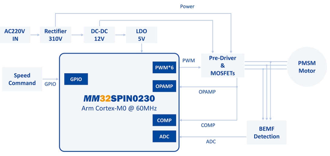 MM32SPIN0230,它采用Arm® Cortex-M0內(nèi)核,最高工作頻率可達(dá)60MHz,內(nèi)置32KB Flash和4KB SRAM,具備1路12位模數(shù)轉(zhuǎn)換器ADC,支持11通道,采樣速率達(dá)1Msps,以及4個通用定時器和1個專為電機(jī)控制設(shè)計的PWM高級定時器。此外,它還支持UART/SPI通信,并內(nèi)置2個運放、2個比較器,專為電機(jī)應(yīng)用而設(shè)計。