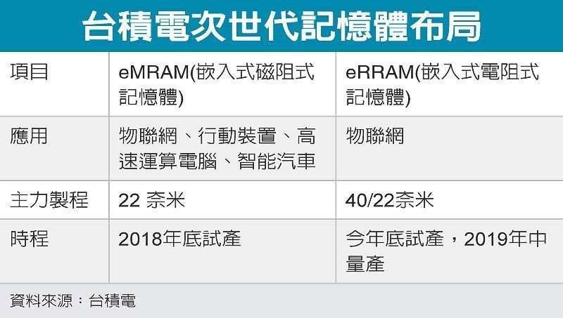 臺積電技術(shù)長孫元成近日在臺積電技術(shù)論壇上,第一次披露臺積電研發(fā)多年的eMRAM(嵌入式磁阻式隨機存取內(nèi)存)和eRRAM(嵌入式電阻式內(nèi)存),分別定于明后年實行風(fēng)險性試產(chǎn),主要使用22mn制程,這將是臺積電因應(yīng)高速運算計算機、物聯(lián)網(wǎng)、行動裝置和智能汽車等四領(lǐng)域所供給效能更迅速和耗電更低的新內(nèi)存。