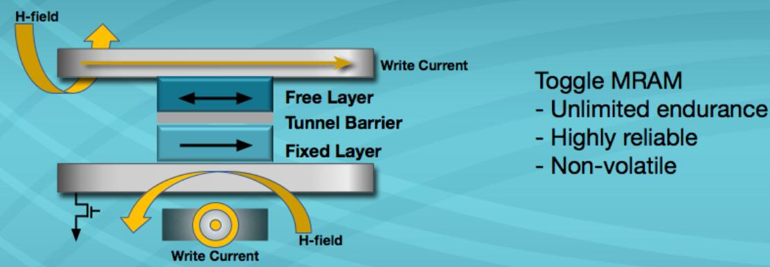 切換MRAM使用1個晶體管,1個MTJ單元來提供簡單的高密度存儲器。Everspin使用獲得專利的Toggle電池設(shè)計,可提供高可靠性。數(shù)據(jù)在溫度下20年始終是非易失性的。