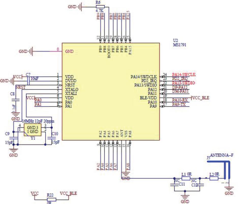 上海巨微MS1791是單模超低功耗藍牙芯片,射頻采用的是2.4GHzISM頻段的頻率,2MHz信道間隔,符合藍牙核心規范4.1。MS1791使用高性能的ARM Cortex-M0為內核的32位微控制器,最高工作頻率可達48MHz,內置高速存儲器,豐富的增強型I/O端口和外設連接到AHB和APB總線。