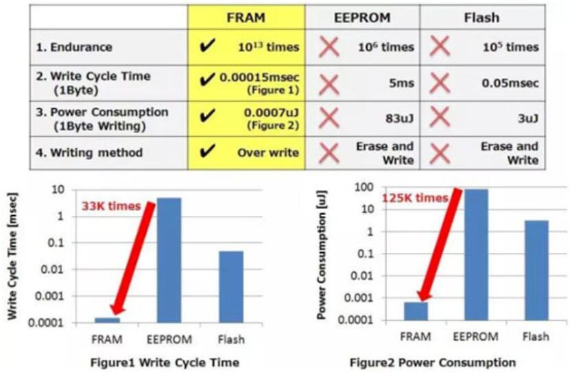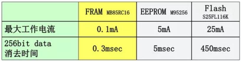 FRAM、EEPROM、FLASH工作電流與消去時(shí)間對(duì)比