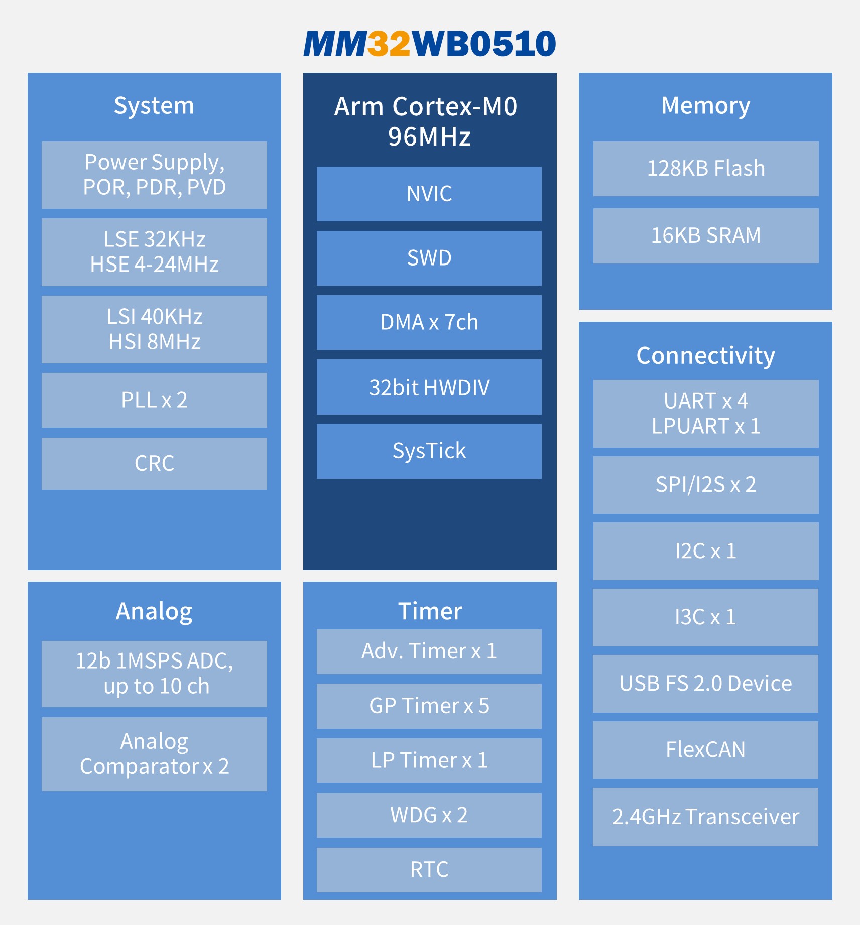 MM32WB0510搭載Arm Cortex-M0內核,主頻可達96MHz,內置128KB Flash和16KB SRAM,并集成了USB和FlexCAN接口,面向智能家居,鍵鼠,消防現場部件,電力電子,汽車OBU,汽車傳感器等無線和多接口類型的應用??蛇x封裝形式包括:LQFP64,LQFP48,QFN48和QFN32。
