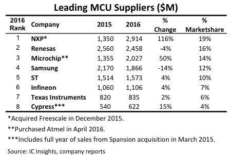 由于瑞薩、三星以及意法半導體等廠商未發起行業并購,所以2016年微控制器業務營收僅有小幅成長,有些甚至還出現下跌。譬如,三星去年MCU業務就出現大幅跌落,是前8大MCU廠商唯一下滑超過10%的廠商。